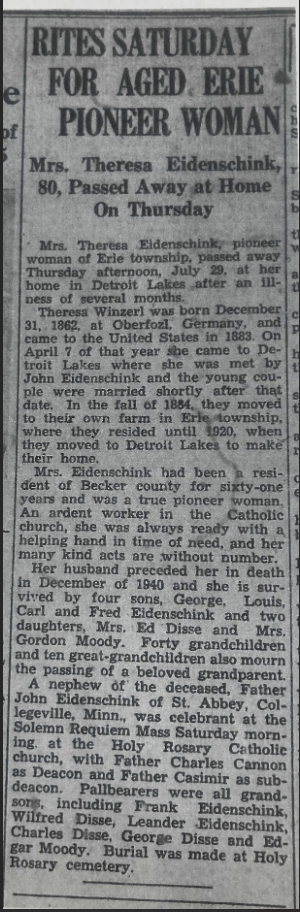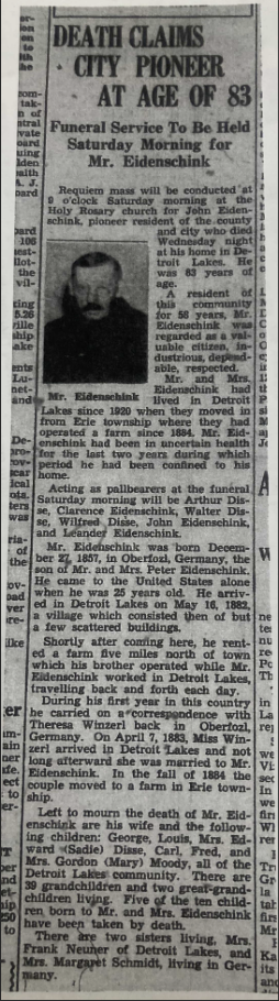 But and so: Great-Great Grandparents John and Theresa lived a good, long life by all accounts, becoming treasured members of the Erie township and Detroit Lakes community. John would later pass away at the age of 83 on December 4, 1940, and is remembered as a pioneer of Detroit Lakes and Becker County:
