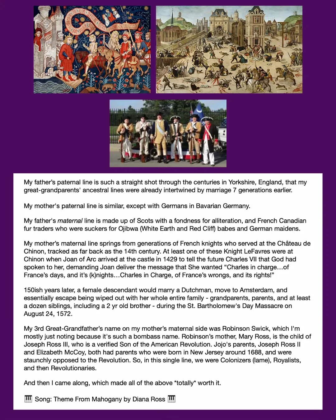 (I also want to pause here and take a moment to recognize that my ability to verify so much ancestry research comes from an unbelievable amount of unearned privilege. Not only am I incredibly fortunate that so much of my heritage is white European and therefore so much more easily traceable through traditional routes and historical means, I am also lucky to have stumbled upon ancestors whose bloodlines have been exhaustively researched and tracked and recorded by many others for reasons we’ll talk about in another post. I also want acknowledge that there are many of you out there reading this who are at the mercy of generic and vague tools when it comes to finding out who your people were and where they came from, and that is fucking bullshit, because no one should have to yearn for that ancestral connection only to be met with the pain of those obstacles. My family is also really lucky when it comes to already knowing where our Indigenous ancestors hailed from + what tribal bands they belonged to, because a lot of the traditional means of genealogy research don’t tell you shit about your indigenous roots, apart from the fact that you may have indigenous ancestry (and they might not even tell you if you have Indigenous heritage at all if those ancestors are farther back than 5-6 generations). I’m grateful that orgs like GedMatch are seeking to fill those gaps, but the learning curve and time+energy cost of entry are still much higher for the regular layperson than they should be.)